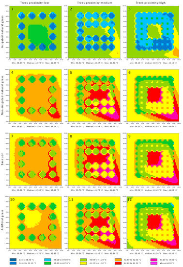 This section presents the main results of the parametric study developed to evaluate the thermal performance of the 12 local park settings using ENVI-met simulation software. The following subsections report the impact of the investigated parks on (1) air temperature, (2) MRT, (3) thermal comfort, (4) surface temperature, and (5) the influence on soil temperature and water content.