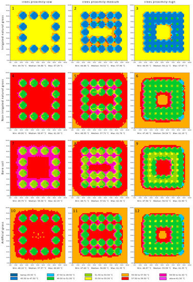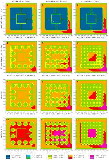 The highest MRT was at 1 p.m., the peak temperature of the day (Figure 5). The median MRTs of the local parks with different tree arrangements and irrigated grass remained under the threshold of 57.1 °C and ranged between 54.11 °C and 54.86 °C. The MRTs remained low inside the parks and within the park context, and ranged between 53.50 °C and 55.50 °C. It reached a maximum slightly above the threshold of 57.1 °C in a limited area on the west side of the trees. The median MRTs in the local parks with high tree proximity and artificial grass, bare soil, or dry grass were under the thresholds of 57.1 °C, 55.99 °C, 56.52 °C, and 56.54 °C, respectively. The MRT was concentrated inside the local park while remaining under the threshold of 57.1 °C within the park context. The same MRT characteristics were applied to the local park with artificial grass and medium tree proximity with a median MRT value of 56.80 °C. The median MRT of the remaining parks was above the threshold of 57.1 °C, including the local parks with low tree proximity and with artificial grass, bare soil, or dry grass, with temperatures of 57.57 °C, 59.08 °C, and 58.67 °C, respectively. The parks with medium tree proximity and with dry grass or bare soil had temperatures of 57.73 °C and 57.81 °C, respectively. There was a high concentration of MRT above 60 °C around the trees in all the parks except the ones with irrigated grass. This was mainly noticed in the parks with bare soil and with both low and medium tree proximity, and the parks with medium tree proximity for both dry grass and artificial grass.