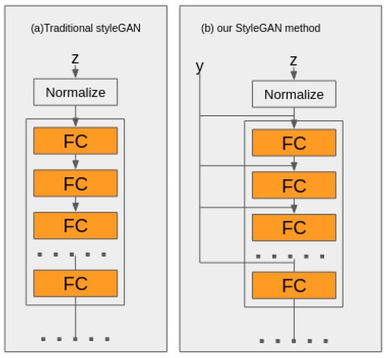 This research performed a nonlinear conversion of the latent vector z to conditional style information into two scalers and , where s stands for scalar and b stands for bias to control an adaptive instance normalization layer (AdaIN). The AdaIN operation is defined as