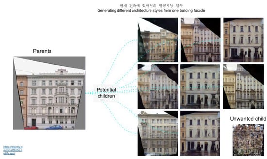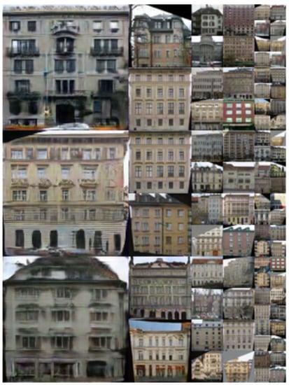 Recently, there have been several experiments with generative approaches, variational autoencoders, in the field of computer vision (VAEs) [4], and generative adversarial networks (GANs) [5]. In particular, GANs show important results in various computer vision tasks, such as image generation [6,7,8], image conversion [9], super-resolution [10], and text–image synthesis [11]. GANs have already been used for facade generation [8]. Pix2Pix is based on conditional GAN [5]. By using conditional vectors, we can control the categories or attributes of the generated images. Pix2Pix generates facade images with the condition of a masked image containing predefined labels for each building element. However, both GANs failed to generate facade images that look realistic.