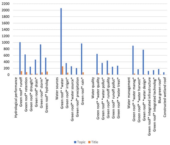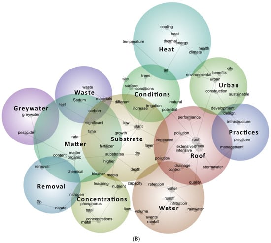 According to the analysis of the results from the text mining in the second stage (Figure 4 and Figure 5B), previous research efforts focused on two main research directions: rainwater runoff quality and alternative water sources for irrigation. Extensive green roofs were three times more often researched for the context of water quality on green roofs than intensive systems, and the substrate and planting layers received more attention than the drainage layer. The substrate investigations were mainly concentrated on substrate depth or the mixture of materials and their ability to retain or release different pollutants, such as organic matter, metals, and nutrients. The plant investigations focused on the effects of different species and their growth related to water quality, including their ability to reduce the concentrations of different pollutants in the soil. Drainage layers were investigated as pollutant sources in drainage water. Other studies emphasised chemical pollutants from pesticides and fertilisers, the surrounding environment, and green roof surfaces. Less research focused on the ability of green roofs to treat waste and greywater and the effect of the retained pollutants from this treatment on runoff water.