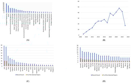 The selected articles were from 102 different journals. The Journal of Ecological Engineering published the most on this topic (11%), followed by the Journal of Water (9%) (see Figure 3A). The United States of America and China were the most interested countries regarding the hydrological performance of green roofs, publishing 78 and 74 articles, respectively (Figure 3C). The authors C. Farrell and V. Stovin were the most published on this topic. They published 16 and 12 papers, respectively (Figure 3D). The published research in this area escalated through the investigated years, except 2017, 2019, and 2022, and reached the maximum in 2021 with 48 articles (Figure 3B). It should be noted that 2023 was included up to early April. However, compared with the same period in 2021, the number of published articles was slightly higher, which reflects the continuously escalating interest in this research area.