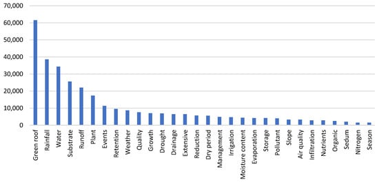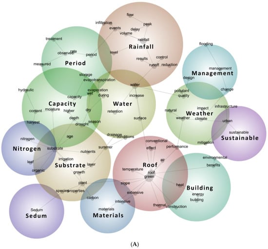 Based on the text-mining analysis of the results (Figure 4 and Figure 5A), rainwater was investigated significantly more than any other water resource, and few studies investigated irrigation. The rainwater investigations focused on water retention capacity and the ability to reduce runoff. Various climate characteristics, such as weather conditions and rainfall events, as well as roof construction elements and layers, were identified as the factors that most influenced the amount of water retained on green roofs. These main findings helped categorise the papers found and structure the results section. Although intensive green roofs are more capable of water management, extensive green roofs were investigated four times more often than intensive ones. Out of the different elements of the green roof structure, the substrate was the most investigated layer, with studies evaluating its effect on water retention and consumption by selecting different plant species, drainage layers, and roof slopes. Sedum was the most frequently examined plant species because of its tolerance to dry weather periods and its limited need for additional irrigation.