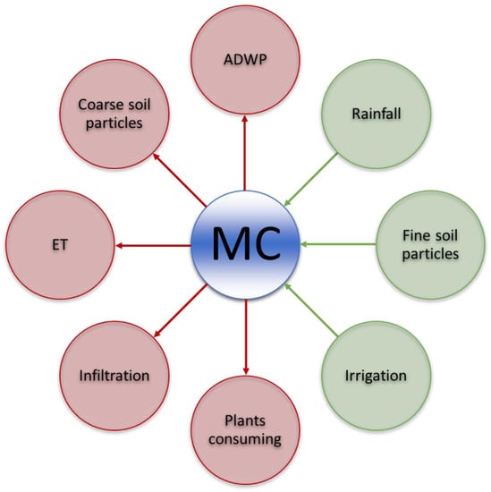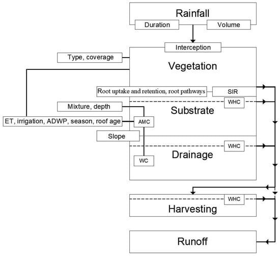 Another important variable is the current moisture content of the substrate prior to a rain event [9,67]. Although some papers have suggested an uncertain correlation between the current moisture content of the substrate and rainwater retention [3,43,63], it strongly affects the substrate’s retention capacity [3,5,39,44,45,65,68,69]. Dry substrate conditions before rainfall events will result in higher retention compared with initially wet conditions [63,67,68,71], as the runoff does not occur until the substrate is at field capacity [64,70]. Figure 6 demonstrates the different factors that affect the moisture content of the green roof substrate.