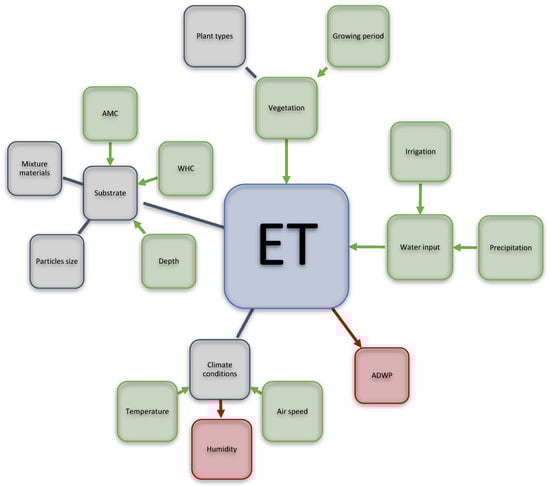 ET is the process of water transpiring from the soil through direct evaporation and plant transpiration [121]. ET rates are affected by various factors, such as climate conditions (e.g., temperature, wind speed, and solar radiation), vegetation, and substrate and moisture content [4,122]. ET reduces the available moisture content of the substrate, leading to increased green-roof retention and detention capacity during rainfall events [4,50,122]. It is considered an effective mechanism in reducing runoff [122], and Ebrahimian and Wadzuk [123] found that the annual green-roof retention capacity due to ET ranged between 11% and 77% of the total rainfall volume. Various substrate characteristics can affect water retention capacity and ET rates [122]. The vegetation layer is also a crucial factor affecting ET, with its availability increasing the ET rate [87]. Different plant species have varying rates of ET; some species, such as Origanum onites, have a high ET capacity, while others, such as turfgrass, have a moderate ET capacity [43,122]. Therefore, selecting the appropriate plant species is essential for improving green-roof hydrological performance under different climatic conditions and irrigation methods [43]. It is also important to consider both ET and infiltration concurrently in the design of green roofs to improve their hydrological performance [123]. Finally, adding artificial shading or trees on green roofs, specifically in hot climates, may reduce the exposure of low canopy vegetation to the sun’s rays, which can help reduce the green roof’s surface temperature and enhance water balance efficiency [72,83,124,125]. Figure 8 shows the influence of different factors on ET that designers must consider in the green roof design process.
