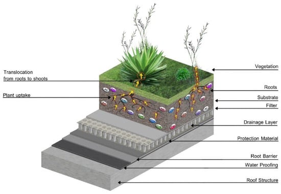 Generally, the reviewed papers agreed that vegetation plays a functional role in reducing the magnitude of pollutants in runoff [41,78,79], specifically when vegetated roofs are compared with non-vegetated roofs [36,57,113]. Vegetation participates in removing pollutants, as it acts as a particle trap for dust, airborne particulates, and biofilters [102,114]. In addition, vegetation supports microbial activity in the substrate layer, which can help break down pollutants and improve runoff quality [115]. A few studies showed that the pollution caused by green roofs is associated with the release of nutrients, which increases if the uptake of the plants is limited [12,27,112]. Plants need nutrients for different physiobiological processes, and these macronutrients can be accumulated through the root system [116], although the retention ability varies between species [117]. Therefore, plant selection should match the substrate composition and the added fertilisers [9,118], considering that plant diversity can reduce some pollutants in the runoff in contrast to monocultures [119]. Plants may also be a source of pollutants, as decaying plant litter, dead roots, and the decomposition of regenerated roots can change the balance of the substrate layer to increase pollutant sources, mainly microbes [27,112].