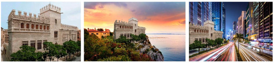 - Taberner, F.; Llopis, A.; Alcalde, C.; Merlo, J.L.; Ros Pastor, A. Guía de Arquitectura de Valencia; ÍCARO-CTAV: Valencia, Spain, 2007. [Google Scholar]