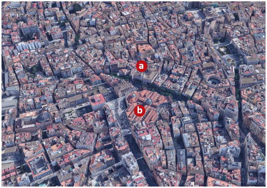Aerial view of the surroundings of the Lonja de la Seda (a) and the Mercado Central (b) (Source: Google Earth).