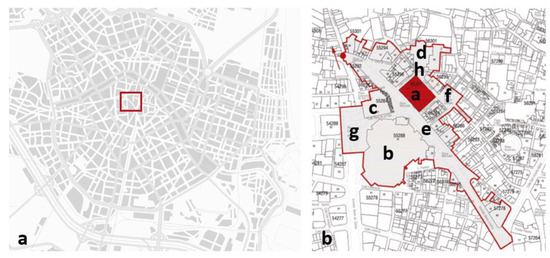 In legal terms, the Special Plan for the Ciutat Vella district (passed in February 2020) outlines a perimeter for the surroundings of the Lonja, considered an asset of cultural interest (see fiche C1-13 from the Protection Catalogue; [29]). This perimeter (Figure 4) includes notable buildings such as the Lonja and the adjacent Consulate of the Sea (Figure 4b(a)), Mercado Central or Central Market (Figure 4b(b)), and churches such as those of Santos Juanes (Figure 4b(c)) and Sagrado Corazón de Jesús de la Compañía or Jesuitical church (Figure 4b(d)); public spaces such as the squares of Mercado (Figure 4b(e)), Collado (Figure 4b(f)), Ciudad de Brujas (Figure 4b(g)), of la Compañía (Figure 4b(h)) and some streets and avenues such as María Cristina avenue, and the streets of Taula de Canvis, Cajeros, Danzas, de la Lonja, Pere Compte, Ercilla, Derechos, Vieja de la Paja, Sampedor; as well as the dwellings and buildings included in or adjoining this perimeter.