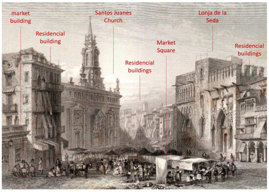 View of Plaza del Mercado (author: Rouargue, 1850 [21]), showing the Lonja de la Seda to the right, the market buildings and the Church of Santos Juanes to the left, and the surrounding residential buildings characteristic of the square’s surroundings.
