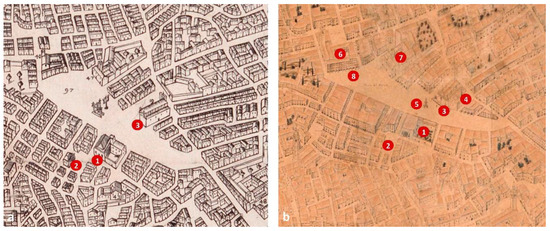 (a) Detail of the Market Square and the surroundings of the Lonja on the map of Mancelli (1608) [14]; (b) Plano de Tosca (1704) [14]; 1. Lonja de la Seda; 2. Lonja del Aceite; 3. Church of Santos Juanes; 4. Chapel of Communion of the church of Santos Juanes; 5. fountain by Juan Bautista Pérez Castiel; 6. church of La Merced; 7. convent of Santa María Magdalena; 8. porticoes on the different façades.