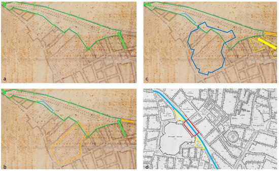 The evolution of the market square (the colours correspond to the different phases): (a) the square and its entrances before the transformations of the 19th century (in green); (b) the insertion of the Market of the Porticos (on the plan of 1892, [14]) (in orange); (c) the insertion of the Central Market (on the plan of 1892, [14]) (in blue); (d) the spaces (in yellow and red) resulting from the transformations of the square and the insertion of the tram (in cian) on the 1944 plan [14].