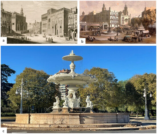 Whereas a decorative fountain had spouted wine in the market square in 1585 for the visit of Felipe II ([6], p. 159), in 1672 Juan Bautista Pérez Castiel built the first true fountain in the market square, with water driven by a wheel located on Cenia Street (Figure 8a). It was also used to water the garden of the Lonja and supply water to the Guild of Water Carriers or firemen, whose headquarters were in the basement of the adjacent Consulate of the Sea ([6], p. 68). This fountain was replaced in 1852 with a cast iron fountain manufactured in France (Figure 8b). This fountain, which arrived in Valencia by boat, was transported for free from the port to the city centre on the recently inaugurated railway, whose owner, José Campo (1814–1889), had been born at number 80 of the market square ([6], 190) and wished to improve his neighbourhood. In 1875, some sculptures of children and decorative details were added. In 1878, this fountain was moved to Alameda Avenue, beside Mar Bridge, before being moved again in 1933 to its current location, also on Alameda Avenue, beside Aragón Bridge (Figure 8c).