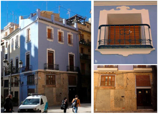 But there are other striking details (Figure 10c): the ground floor in rough ashlar, with a simple corner without decoration and a Roman arch at the entrance. This suggests it was a medieval construction built before the War of the Guilds (1519), after which Roman arches were rarely found at the entrance of residential buildings. The brick construction visible in sections missing rendering is in brick-supplemented rammed earth in dimensions characteristic of the 14th century. In contrast, the industrial brick used to block off the Roman arch is characteristic of the late 19th or early 20th centuries, which is in line with the dates of the interventions on the first-floor balconies. The somewhat irregular distribution of the openings on the ground floor, the windows on the first floor, and the loggia on the second floor with no proposed vertical symmetry, also suggests a building prior to the advent of the Academia de Bellas Artes de San Carlos, which sought geometric order on façades whenever possible. In addition, as will be detailed later on, the 18th century saw the start of a process of completing medieval crown loggias, which were transformed as yet another floor on the building in order to accommodate the city’s growing population, a process not observed on this building.