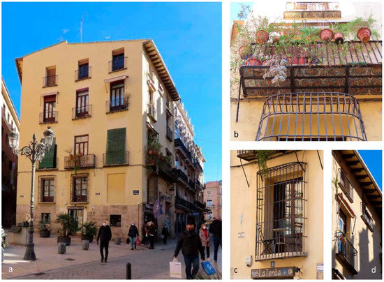 (a) The building on Lonja Street no. 8, on the corner of Compañía Square and Cenia Street; (b) detail of the balcony on the second floor; (c) detail of the first gate; (d) details of the balconies of the upper floors. (Source: authors).