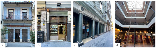 (a,b) Buildings with shops on their respective ground floors at San Fernando Street; (c,d) building called “El Siglo Valenciano” nowadays ((c) exterior; (d) interior)). (Source: authors).