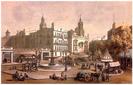 However, beyond the legal definition of surroundings for assets of cultural interest, and with the freedom afforded by not having to establish regulations, this text aims to analyse certain elements or factors which over time have contributed—and continue to contribute—to the definition of the surroundings of the Lonja. Most of the images of the Lonja produced by 19th century travellers (including Laborde, 1807; Charles de Lalaisse, 1812; Rouargue, 1850) [20,21] show the market square on the right-hand side of a triangular space, where it appears surrounded by residential buildings, opposite the church of Santos Juanes and on occasions the market building. The square is always bustling, full of people and stalls. The view of the 19th century traveller is fixed on the elements that define the surroundings while also providing guidance (Figure 5).