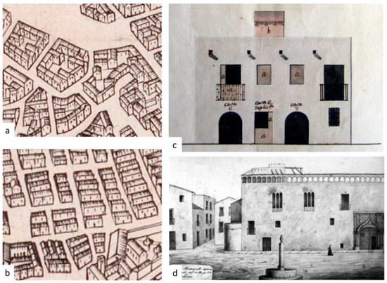(a) Detail of the houses as a result of the transformation of the Islamic city (plan by Mancelli, 1608, [14]); (b) detail of the houses resulting from the construction of the new medieval city (plan by Mancelli, 1608, [14]); (c) plan of a house of the time (AHMV).; (d) image of the Lonja and the houses that surrounded it [21].