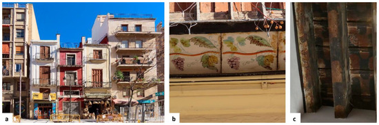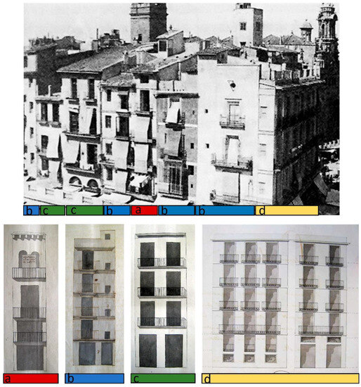The surviving buildings, which have undergone numerous interventions and transformations, have become a hybrid mix of architectural styles and elements. Many of these transformations are documented in the files of the AHMV [27] and their history can be briefly examined for a more in-depth understanding of the value of these survivors of history. In the 18th century, closed-off iron balconies were inserted, the loggias or small chamber windows were blocked off, full-length windows were opened onto the balcony, and one or two floors were also added. The widespread presence of balconies in modern Valencia is explained by an 18th century transformation changing a city with plain façades with windows into a city with balconies on all buildings and heights. Closed-off balconies with wrought iron plates and bars, ceramic flooring and struts to support the structure are from this period. In the mid-18th century, the size of ceramic floor tiles changed (from 11.25 cm per side to 22.5 cm per side, or from half to one Valencian palm), lightening the load of the “cages” as fewer plates were needed to secure the tiles. The installation of balconies was associated with opening up windows to create doors for accessing the balconies, in most cases adding joinery, and shutters with no glass, usually folding into the interior side of a thick façade wall seen on the edge of the windows. Interventions like these are widely seen in the buildings around the Lonja, although the examples currently found on the stretch from the market square between the Lonja and Tabla de Cambios Street and between Encolom Street and Bolsería Street are particularly interesting. On these stretches, we find two groups with three and four dwellings which perfectly illustrate these interventions, as well as others from the 19th century (Figure 18).