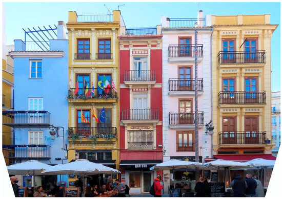 Sixty years later, when the Revolution of September 1868—known as “la Gloriosa”—led to Queen Isabel II (1830–1904) being deposed and exiled, the Junta Superior Revolucionaria de Valencia, headed by the former mayor José Peris y Valero (1821–1877), ordered the demolition of the Jesuitical church [43]. Years later, in 1885, the architect Joaquín María Belda Ibáñez (1839–1912) built a new church, still seen today, following the outlines of the demolished church. The residential buildings on the corners of Lonja Street and Cenia Street and Cordellats Street and Danzas Street, examples to be used for in-depth analysis, have witnessed—as is the case with other buildings—part or all of what has happened in the history of the square or the Lonja itself.