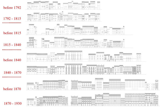 The transformation of the image of the city through the conversion of the facades, demolitions and new buildings during the 1792–1930 period. The reconstruction has been completed through real projects from the files of the Archivo Histórico Municipal de Velencia [27].