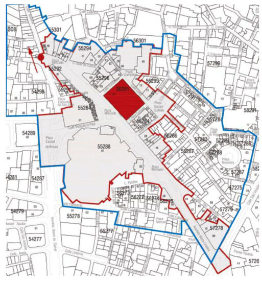 Although in the Islamic era, there was already a space outside the walls used as a market, the consolidation and development process began in the Middle Ages, when the space outside the walls was taken over through the construction of convents, the incorporation of the arrabales and the foundation of the pueblas (medieval urban settlements), which gradually formed the outer perimeter of what later became a medieval city delimited by walls erected throughout the 14th century [30]. This process of progressive colonisation of the territory surrounding the medina led to the definition of the market square through the gradual construction of a number of religious buildings. The foundation in 1240 of the Convent of La Merced ([8], p. 72) was followed by that of the Convent of Santa María Magdalena, and the establishment in 1268 of the former hermitage of Santos Juanes. This space delimited by religious buildings to the southwest and by the Islamic wall to the northeast was gradually incorporated into the medieval city, where increasingly bustling temporary and permanent shops could be found in the triangular area, while artisans and workshops tended to be located on the perimeter. The construction of the new medieval wall and the sizeable expansion of the urban area meant that the market square remained within the geometrical centre of the city.