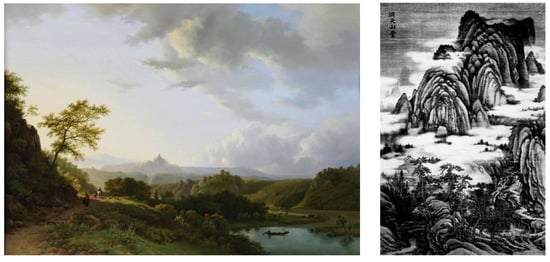 Figure 4. The promise of adventure on the way to a distant objective in European and Chinese depictions of ideal landscapes (image sources: Wikimedia, Public Domain, National Palace Museum, Taiwan).