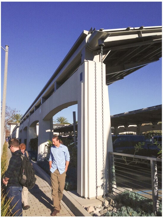 PBAS energy landscapes have the potential to garner community support more effectively by accounting for the community’s diverse needs, values, and culture []. An example of this can be seen in the solar photovoltaic system installed at Burbank Power and Water in Southern California (Figure 1). The photovoltaic system advantageously provides shade to employee vehicles while capturing the plentiful sun rays in this climate. Meanwhile, panels are intentionally angled in a way to reference the aviation history of the community. Furthermore, the structural support that elevates the panels doubles as part of aesthetic pillars and fencing that matches the Art Deco architectural style of the historic campus and even includes rain chains for stormwater management. The site seamlessly integrates with a community-facing “green street” along a previously neglected boulevard. Through this approach, the site not only tackles climate challenges, drought resilience, and energy requirements but also celebrates the community’s rich and distinctive heritage.