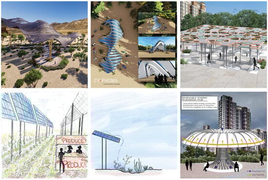 In contrast to the monocultural deployment of solar photovoltaics, which can lead to a downgrading of landscape diversity in desert areas, landscape architects can contribute to the integration of a variety of solar configurations that respect and enhance the urban, suburban, and peri-urban characters of different places [,]. By carefully analyzing the unique qualities and context of each site, landscape architects can select the most suitable solar configurations that complement the existing built environment and landscape, thereby ensuring a harmonious integration of green energy technologies.