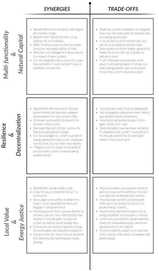 The conference had many wonderful suggestions and ideas. General consensus amongst researchers was that the following co-created ideas: avoiding developing energy infrastructure in undisturbed lands, reducing evaporation from reservoirs and canals with agrivoltaics/flotovoltaics, civic pilot projects, green land art, and microgrids were promising solutions for decentralized energy production and avoiding transmission issues. Microgrids and decentralized energy redundancies were identified as also being in the interest of disaster relief efforts and national security. The conference homed in on the indelible link between water and energy, with many participants highlighting the potential of micro-hydro power as a solution and generating ideas for multi-functional, community-owned sites. The discussions around these multi-functional sites underscored the valuable role that landscape architects currently play in the realm of stormwater reclamation at a community level and shed light on the role landscape architects could play in the future of sustainable energy sites. There was also a consistent cry for policymakers to shift policies to promote the development of renewable energy in already developed regions to make progress towards a sustainable energy future; however, these concerns with policy and the political process remained largely amorphous for the duration of the conference. As such, no discrete, actionable political solutions were proposed by participants, and even if complete and detailed policy interventions had been proposed, they would be outside of the scope of our research.