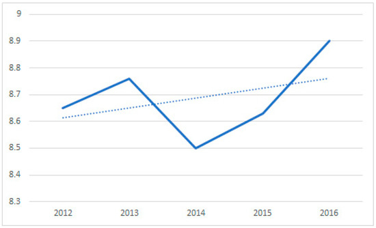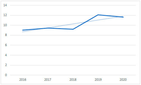 In terms of the rental market, the average in Seville for the same period ranged between 7.45 EUR/ in 2016 and 9.73 EUR/ in 2020 (Figure 4). However, the Casco Antiguo district again showed higher values compared with the rest of the city. Figure 4 shows how the rental values in this district, also recorded as an annual average in the Statistics Service and obtained from the Fotocasa webpage (9.05 EUR/m2 in 2016, 9.46 EUR/m2 in 2017, 9.18 EUR/m2 in 2018, 12.12 EUR/m2 in 2019). Following the major increase observed in 2019 in relation to previous years this average then decreased to 11.63 EUR/m2 in 2020. Once again, an upward trend line was observed with the gradual increase in price of rentals for long-term residence.