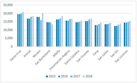 An initial economic assessment was carried out on the average per-capita income in the different neighborhoods of the Casco Antiguo district from 2015 to 2018 (Figure 2). A series of significant trends and variations were identified based on the evolution of the values compiled by the Statistics Service [29,30]. Relatively homogeneous income values were observed for the year 2015, with an average of 15,000 euros per person. However, this was clearly an upward trend, with values increasing in all the neighborhoods. Substantial growth was recorded for 2017, with values ranging between 16,065 and 20,177 euros per person. For the final period analyzed, 2018, a final upward trend could be observed, with increases in all except in the neighborhood of San Bartolomé, where it occasionally decreased, and also in the neighborhood of Museo, where a peak disrupted the trend for the other years and neighborhoods. These data point to a gradual increase in the wealth of the central neighborhoods of this district, despite lingering differences between both of these neighborhoods.