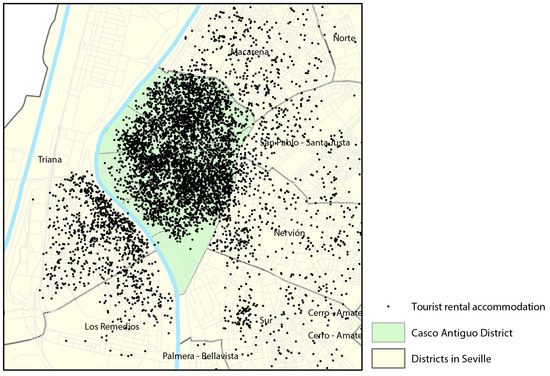 Figure 5 shows the major concentration in the district of Casco Antiguo, with a high number of apartments devoted to tourist use. The same is observed in the Triana district, albeit on a smaller scale, as a very high concentration of tourist rentals is also found in the area by the river.