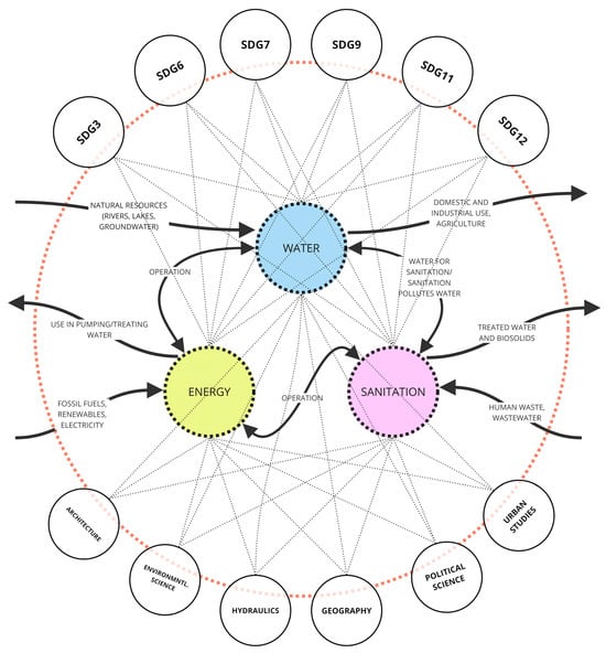 The water–energy–sanitation (WES) nexus and links to SDGs and academic/professional disciplines.