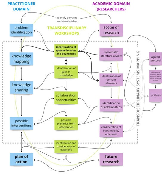 The iterative process of transdisciplinary research employs systems mapping as the underlying mechanism for the identification and evaluation of interventions, whereby transdisciplinary workshops act as the main vehicle for knowledge integration and knowledge translation []. Figure 2 presents a schematic overview of key elements of transdisciplinary working. Under ideal circumstances, this process includes (a) the collaborative identification between academic and non-academic stakeholders of the project aims and scope; (b) the identification of the relevant knowledge domains and, subsequently, knowledge gaps and needs in theory and practice; (c) the definition of systems boundaries and identification, through systematic literature reviews, of domain elements and their interrelations; (d) the integration of different knowledge domains and findings; and (e) the identification of possible interventions and their sustainability outcomes and trade-offs.