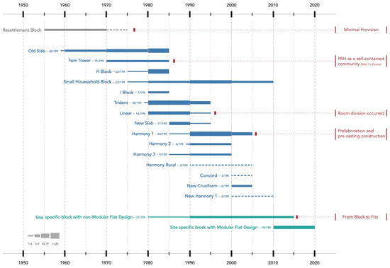 Starting in 1992, the PRH stock was reclassified using categories based on flat sizes that aligned with the new Harmony block provision [40]. The categories were small flats with an internal floor area (IFA) of 13–25 m2, one-bedroom flats with an IFA of 32–43 m2, two-bedroom flats with an IFA of 39–48 m2, and three-bedroom flats with an IFA of 49–60 m2. The distribution of these flat types across the PRH stock significantly changed over time. In 1993/94, it was 11% for small flats, 39% for one-bedroom flats, 44% for two-bedroom flats, and 6% for three-bedroom flats, but by 2002/03, it changed to 25%, 24%, 34%, and 17% [41,42,43,44,45]. Therefore, one- and two-bedroom homes became the primary forms of housing provided by the PRH programmes (Table 3).