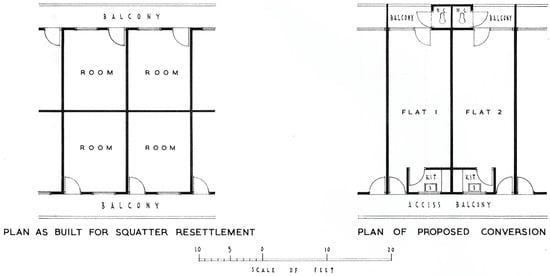 The Mark I type resettlement housing block, designed by G. P. Norton, an architect of the Public Works Department, is considered the prototype of Hong Kong’s public housing. It combined elements of the local tenement house (tong lau) with post-war working-class terraced housing in Britain [21]. In use from 1954 to 1964, the H-shaped Mark I block had six or seven storeys and consisted of two parallel slabs (Figure 2). Each slab had back-to-back single-room units accessed from an external deck. The emergency housing units were only 11.15 m2 (120 ft2) in size. Recognising the substandard nature of these dwellings, the potential conversion into self-contained flats was considered already at the inception of the housing model (Figure 3).