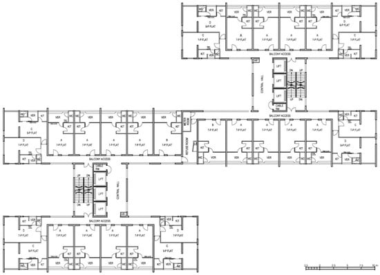 Trident 3 typical standard block floor plan. Source: Hong Kong Housing Authority. Available online: https://www.housingauthority.gov.hk (accessed on 5 December 2023) [26].