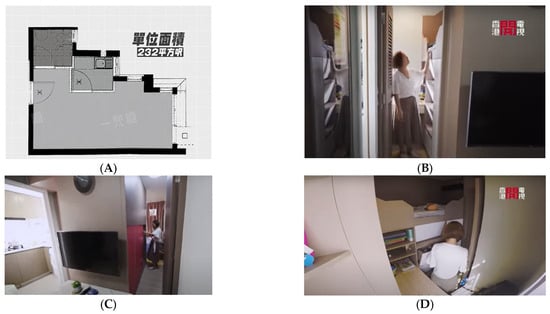 A nano flat in Hong Kong. (A) Layout of the 15 m2 flat. (B) Fold-out bed. (C) Stairs with cupboard. (D) Upper-level bedroom spaces for parents and a child. Source: A family of four people in a 200-foot nano building. Available online: https://www.youtube.com/watch?v=hnF7yGBB1WE (accessed on 7 December 2023) [62].