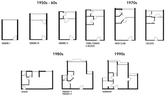Different standardised housing block and dwelling designs in Hong Kong characterise four distinct periods that encapsulate the evolving role of public housing [15] and changes in minimum dwelling size (Figure 1).