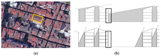 Location of case study in the historical layout. At the bottom, solar obstruction occurring with the maximum inclination of solar beams in summer (a) and at winter (b), at noon. In both cases, a square frame indicates the studied façade.