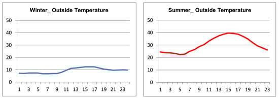 Example of on-site hourly air temperature by the weather station in the building (winter and summer).