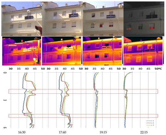 The thermography images were taken in the afternoon, when the less favorable conditions occur. The solar protections prevented the incidence of radiation through the windows. Moreover, the louvres also reduced heat gains on the opaque surface. Figure 4 and Figure 5a display photographic and IR images along with the façade’ surface temperatures throughout the day.