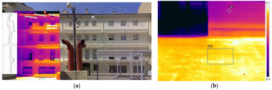 Emissivity, the reflected and atmospheric temperature and relative humidity were measured to process and adjust the images to the actual conditions in the analysis. The atmospheric temperature and relative humidity were measured in situ using a portable thermo-hygrometer. Adhesive tape of known emissivity was used to control the emissivity of each material in such a way that the emissivity of the finishing was 0.95, while the reflected temperature was measured with a wrinkled aluminum foil [77,78]. The measured emissivity of the pavement and ETICS surface was 0.90 and 0.95, respectively. The distance between the façade and the thermography measuring point was kept at 10 m so that the instantaneous field of view (IFOV) would remain constant. Even though this distance probably renders detecting defects infeasible, it did not have a relevant impact on the research outcome due to its main goal [85]. Finally, a summary worksheet was created to systematize the collected data, containing observations about the façades, images and climatic conditions. Lastly, IR images were backed up by photographic images as an aid to their correct interpretation, and the images were assessed with FLIR TOOLS software, version 5.x.