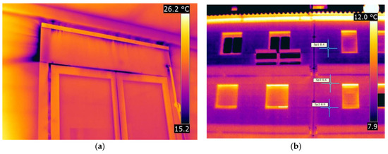 In this case, the horizontal solar protections reduce the convective air flow and the air locked under them, following the trend in summertime (Figure 6). In turn, this effect generates an increase in temperature under the louvres in comparison to the open areas of the façade. The temperature difference between the aforementioned areas at 22:00 h surpasses that found at 18:00 h or 19:00 h, with up to 1 °C at 22:00 h between the area under the solar protection and the following exposed area. At this time, outdoor temperature was 10 °C, which implied a thermal leap of 10 °C between the inside and outside. From this point of view, the findings linked to this behavior should be highlighted, since they imply a reduction of heat transfer through the façade wall. In fact, when warm air rises, the maximum heat flux takes place at the upper part of the wall due to the indoor–outdoor temperature difference. The placement of the louvres at the level of the slabs leads to warm air being entrapped under them. This warm bubble of entrapped air leads to reduced heat fluxes and diminished indoor–outdoor temperature differences. Consequently, indoor temperatures become more stable, which is favorable for fuel poverty mitigation. This result is in line with other research in which the combination of different parameters, included the installation of solar protections, are considered as strategic to achieve an overall reduction of the energy demand [91]. Although the position of the high thermal fluxes could be explained by thermal bridges through the slabs, this hypothesis was discarded since thickness of insulation is continuous along the façade avoiding thermal bridges. In addition, a discontinuity of the warm bubble can be observed between louvres which corroborates the hypothesis. On the contrary, the ledge showed a clear thermal bridge, exacerbated because dwellings on the last floor have higher losses of energy because of the percentage of envelope as well as the convection effect and long-wavelength radiation [22]. The same took place with the lintels in which the loss of energy is marked. This is another critical point of the constructive resolution of the façades due to the air infiltration through the wall/window joint, the lower thermal resistance of the window compared to the opaque surface as well as the presence of rolling shutters which drawer, placed inside, which directly communicates indoor and outdoor. In fact, the blower door test, performed on this façade, following EN 13829 [97] with a result of n50 = 6.1 h−1, clearly shows it as a key point (Figure 7a).