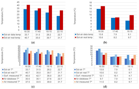 Differences between sol-air temperature and real temperatures; (a) as a function of the outside in summer and (b) in winter. Differences among sol-air and real surface temperatures together with air temperatures in (c) summer and (d) winter.