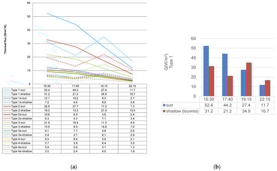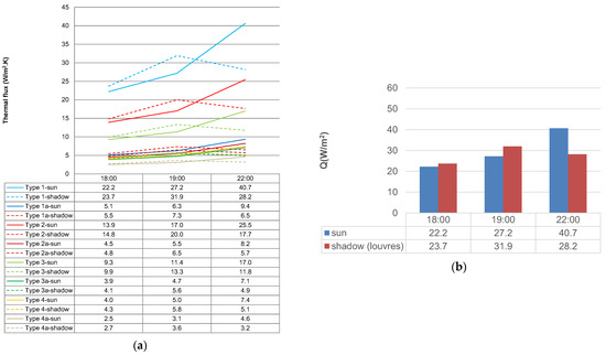 (a) Thermal fluxes according to the construction system throughout a summer day; (b) energy losses Q(W/m2) through the opaque façade exposed to the sun compared to the area under the louvres for the type 1 construction system, in summertime.