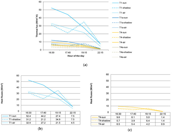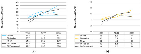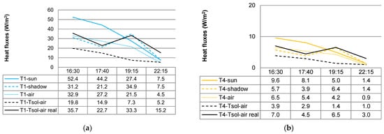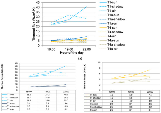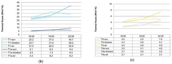 It is important to highlight the different outcomes arising from using either air temperature or surface temperature data to estimate thermal fluxes. In Figure 10a, the thermal fluxes of type 1 and 4 construction systems were computed based on the temperature data of sunny and shaded surfaces compared to those obtained based on air temperature data. The results revealed that thermal fluxes were considerably lower when computed based on air temperature data (Figure 10). In fact, these thermal fluxes displayed low values both during the afternoon and at night. Early in the afternoon, the lowest thermal fluxes can be observed in the shaded areas due to its lower temperature compared to the air or sunny areas. However, at night, thermal fluxes increased in both sunny and shaded areas. A possible explanation for this lies in the lower air temperatures in comparison to the walls’ surface temperatures. The heat flows that are air temperature-dependent do not undergo or underestimate, as aforementioned, the effect of solar radiation during the day and therefore would exhibit a behavior similar to that of shaded areas during the daytime. Yet, the same is not true during night-time, where heat flows from areas that had been shaded or exposed to the sun are higher than those that take air temperature into account. These results contradict the conventional assumption that thermal flows estimated with air temperature data would be similar to those of shaded surfaces. Thermal flows were found to decrease proportionally to air temperature in summer, during both day and night-time. This suggests that the external surface resistance value (Rse) must be tailored to the local climate conditions.