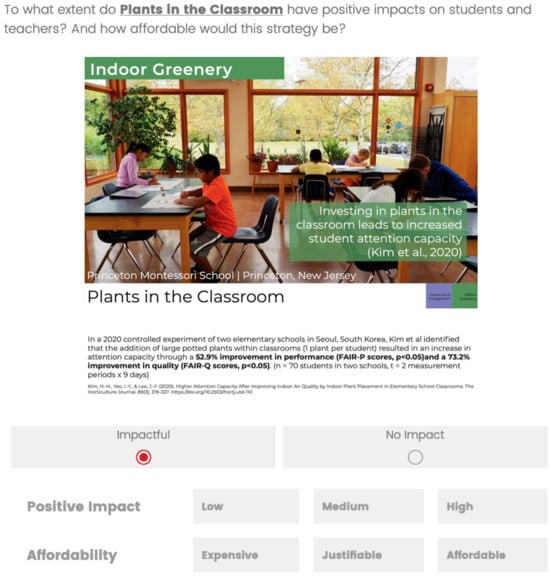In the Indoor Greenery category, plants in the classroom were identified to be the most impactful and affordable strategy for student and teacher outcomes at 95.9%, as compared to green walls at 37.5% (p = 0.00).