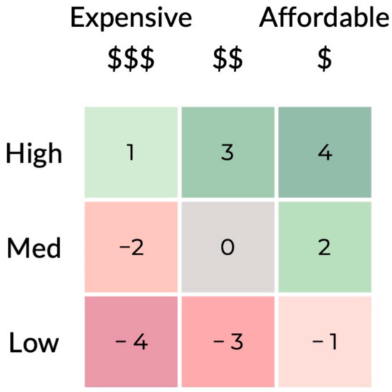 Given these three levels of positive impact and affordability to choose from, a 3 × 3 matrix for card ranking was defined. Each box was assigned a score on a scale of −4 to +4. A score of +4 denotes a ranking of “High Impact and Affordable”, while a score of −4 represents “Low Impact and Expensive”. Additionally, it was decided that since affordability is very important to public schools, a strategy that is deemed to be “Medium Impact and Affordable” would score higher than a strategy that was “High Impact and Expensive”. The same scoring applied to “Low Impact and Affordable” vs. “Medium Impact and Expensive” strategies (Figure 3).